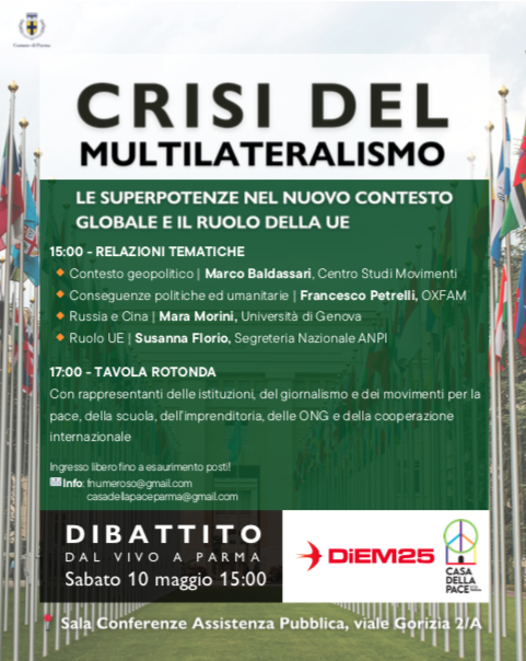 DiEM25 e Casa della Pace, in collaborazione con il Comune di Parma, organizzano un convegno dedicato alla crisi del multilateralismo e ai nuovi equilibri geopolitici globali.
